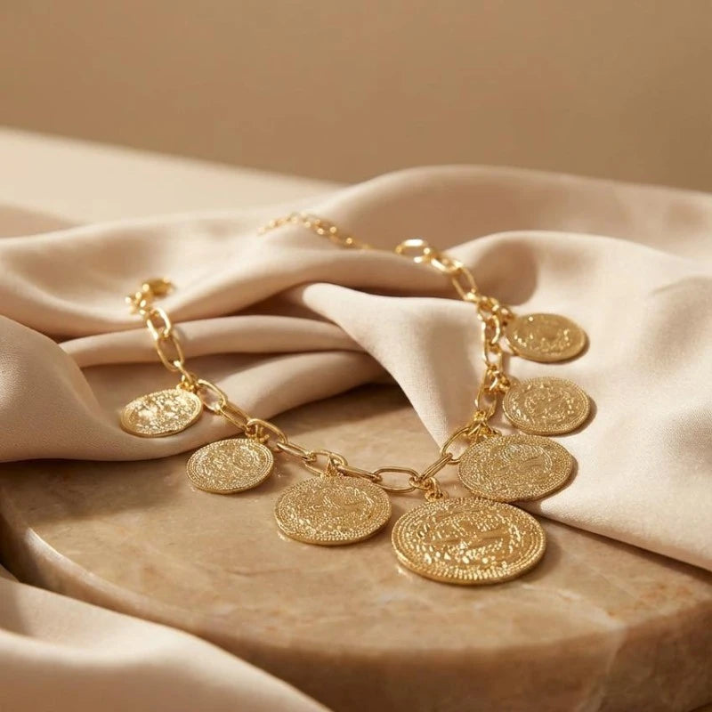 يجمع سوار العملات المعدنية المطلي بالذهب بين سحر الكنوز القديمة وأناقة العصر الحديث، وهو مصمم للمرأة التي تُقدّر المجوهرات ذات الطابع المميز. يتميز هذا الإكسسوار بسلسلة من العملات المعدنية المنقوشة بدقة، معلقة بسلسلة متينة، مما يخلق حركة جذابة مع كل حركة.