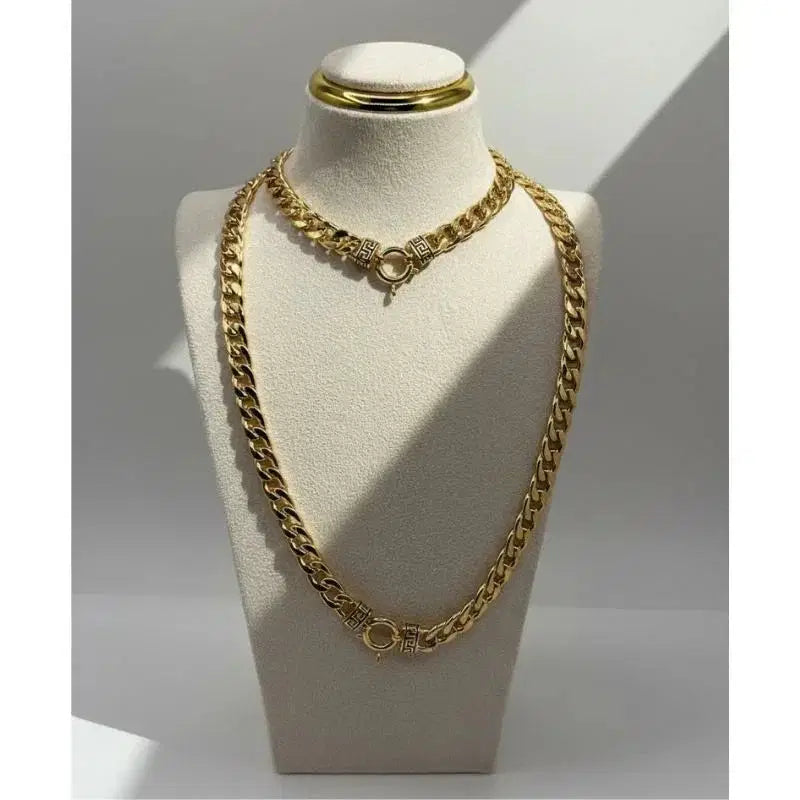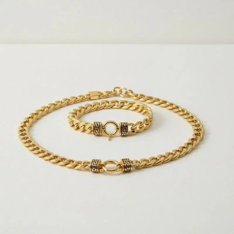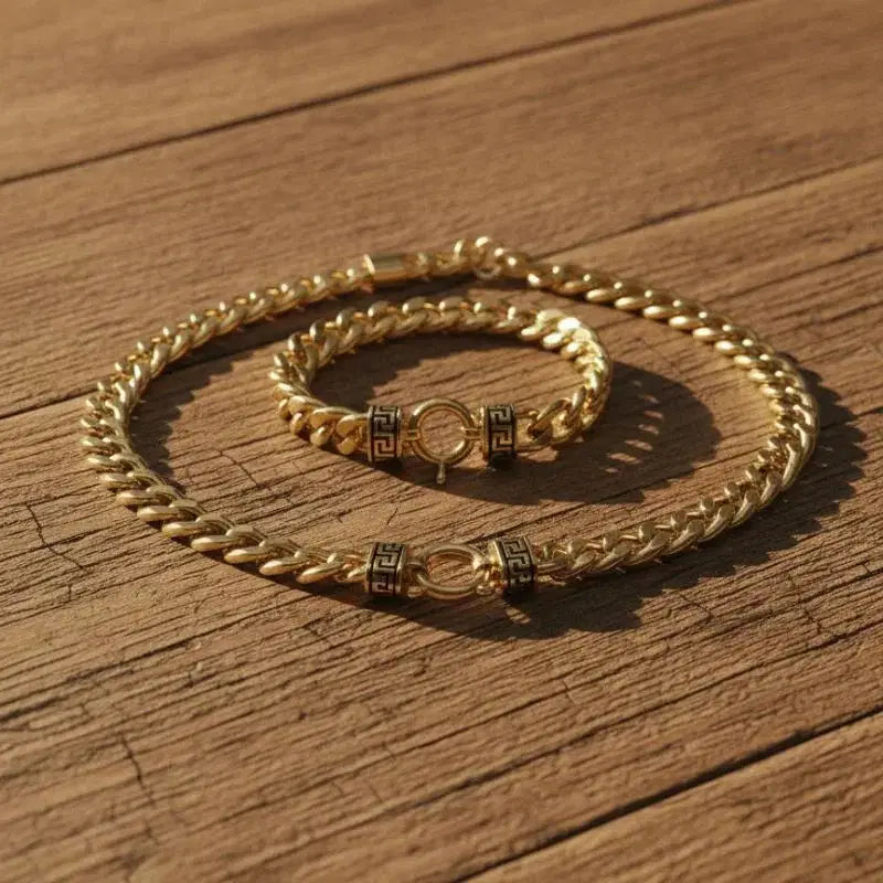 طقم سلسلة وسوار كوبان لينك مطلي بالذهب بنمط المفتاح اليوناني، تحفة فنية تجمع بين الرقي الخالد والتصميم الأنيق، صُمم بدقة متناهية للمرأة العصرية التي تُقدّر الفخامة الراقية والجرأة في اختيار أزيائها. يتميز هذا الطقم الرائع بطلاء ذهبي عالي الجودة يعكس توازناً مثالياً بين الأناقة الكلاسيكية واللمسة الإيطالية العصرية، ليضمن بريقاً فائقاً من جميع الزوايا.