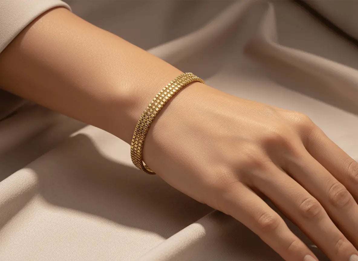 - مواد فاخرة: يتميز بطلاء ذهبي فاخر فوق الفولاذ المقاوم للصدأ المتين، مما يضمن أن السوار مضاد للحساسية، ومذهل، وآمن لجميع أنواع البشرة.