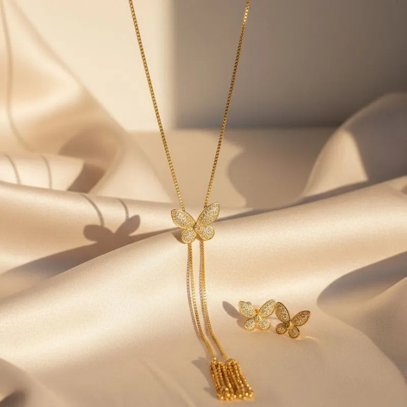 The 18K Gold Plated Shimmering Butterfly Lariat Set is a masterpiece of delicate design and modern femininity. Featuring a graceful lariat-style necklace with crystal-encrusted butterflies and elegant gold tassels, this two-piece set is designed to capture the light and elevate your presence at any gathering.
