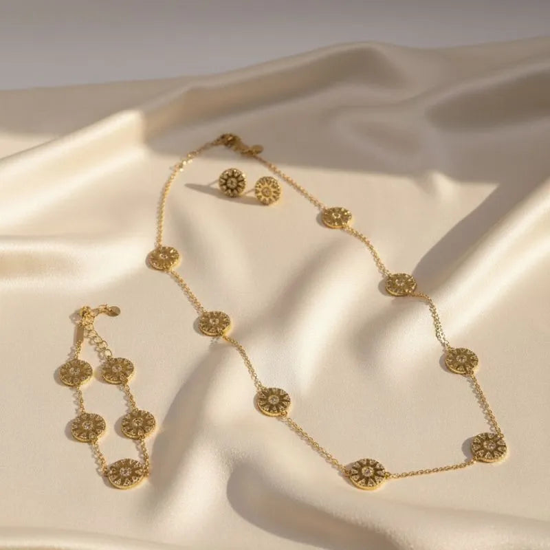 The Daisy London Apollo Amulet 18kt gold-plated sterling silver Full Set stands as a masterpiece of timeless sophistication, meticulously crafted for the modern woman who appreciates refined luxury. This comprehensive collection features a high-quality 18-karat gold plating over a premium sterling silver and stainless steel foundation, offering a complete, coordinated look to ensure maximum brilliance from every angle.