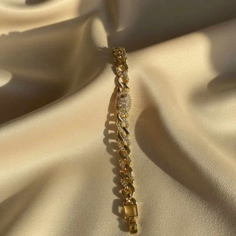 The Iced-Out Gold Cuban Link Bracelet – Baguette Box Clasp is a bold fusion of street-style confidence and high-fashion luxury. This heavy-duty statement piece features thick, rounded links that are meticulously encrusted with shimmering stones to ensure a brilliant, 360-degree glow. The centerpiece of this design is its unique, oversized box clasp, which is set with elegant baguette-cut stones for a seamless and ultra-premium finish.